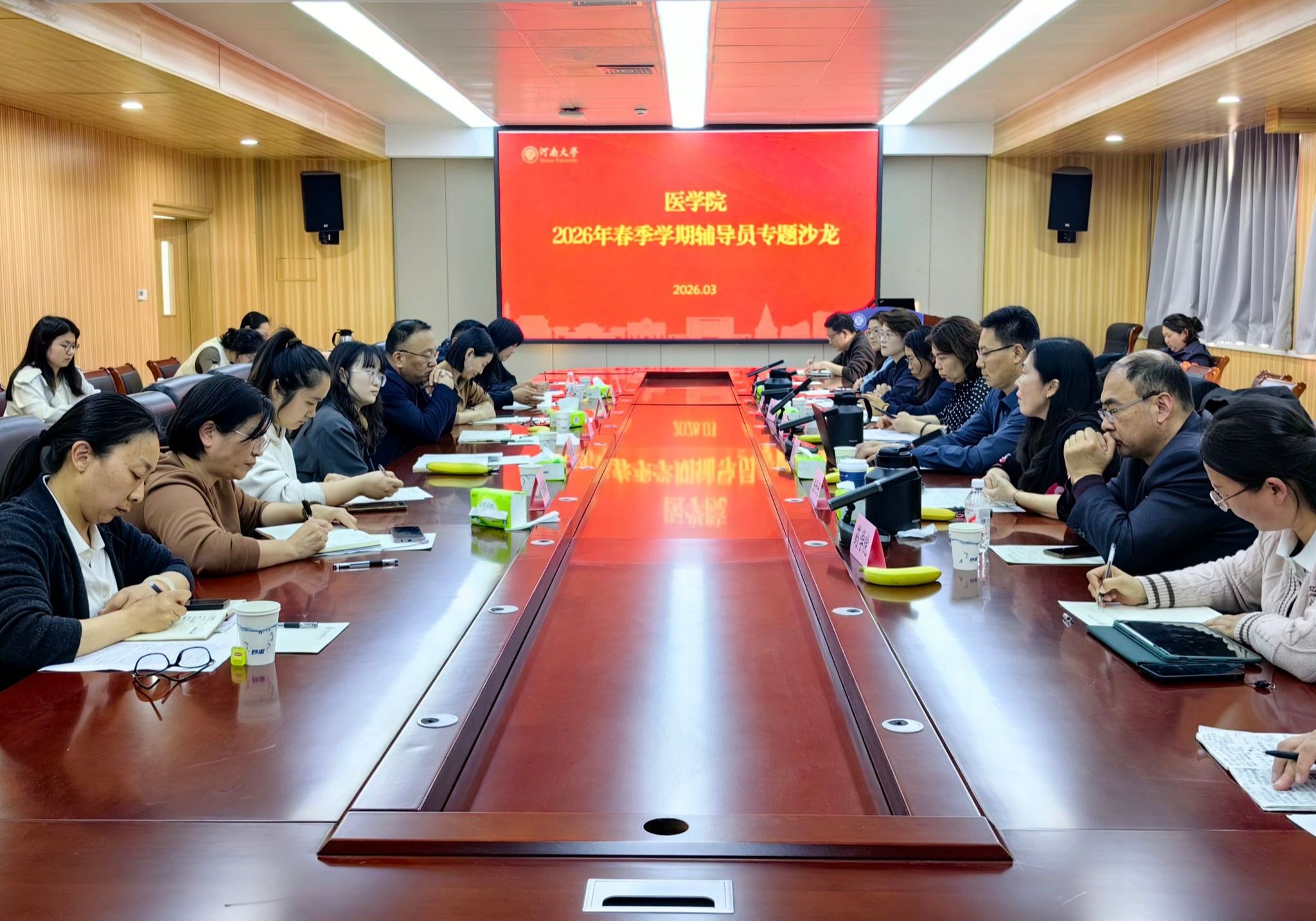 为深入贯彻落实学校2026年学生工作会议精神,3月31日下午,医学院在曾宪梓楼214会议室举办“推动毕业生量质并重的就业发展”为主题的辅导员专题沙龙。党委统战部部长王莹,就业创业指导中心主任张磊,党委学工部副部长、学生处副处长李平,以及医学院所属各学院、医院、科研机构分管学生工作领导、全体专兼职辅导员等40余人参会。医学院学生工作组组长陈丹丹主持沙龙。