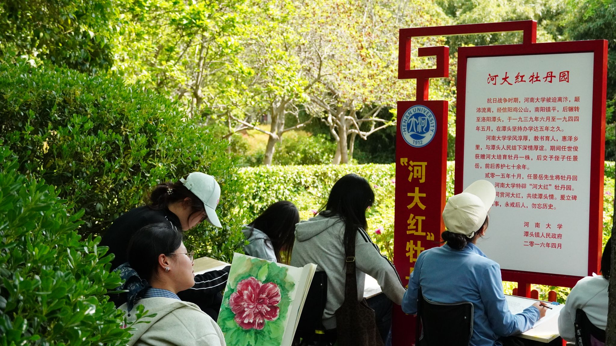 4月11日下午,美术学院2025级本科生团员齐聚河南大学明伦校区牡丹园,在朋辈辅导员杨田田的指导下,开展了“传河大风骨 画烽火牡丹”主题团日活动。大家以笔为媒、以画传情,在色彩晕染间回望校史、感悟河大精神,将园中盛放的“河大红”牡丹之美、风骨之韵定格于画纸之上。