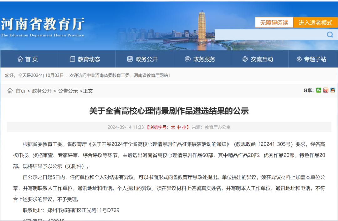 近日,中共河南省委教育工委办公室 河南省教育厅办公室发布《关于公布全省高校心理情景剧遴选结果的通知》,经资格审查、专家评审、综合评议等环节,我校报送的《网络风暴》获评河南省高校心理情景剧精品作品。