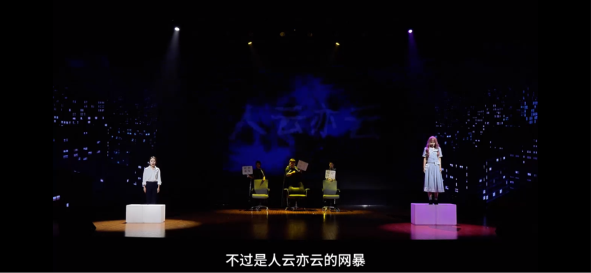 作品《网络风暴》是一部深刻探讨网络暴力对个人心理影响及其心灵重建过程的心理情景剧。本剧以线上社交为背景,利用独白、旁白、歌队、象征性道具等手法,讲述了主人公林华由于遭受网络暴力,出现了自尊心严重受损、自我认知混乱、焦虑抑郁和自杀危机,在心理咨询老师的及时介入和专业帮助下,主人公林华逐步改变了不合理认知,学会了理性处理外界评价,并积极寻求社会支持,最终提升了心理韧性,勇敢地面对网络暴力。同时也呼吁公众提高网络素养和道德意识,共同营造一个健康、和谐、尊重的网络环境。